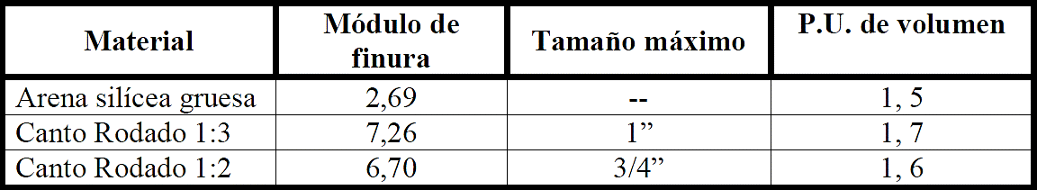 La dosificación se compuso de un cemento portland CPC-40, cemento portland compuesto (hasta tres adiciones) resistencia de mortero de 40 MPa (Norma IRAM 50000); arena silícea gruesa de una cantera de la zona; canto rodado silíceo tamaños 1:3 y 1:2 y un aditivo superfluidificante. Las características de los agregados se informan en la Tabla 1.