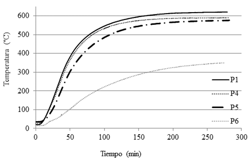 La Figura 5 muestra la evolución de la temperatura dentro de los bloques (Tint) para las primeras tres configuraciones de pared, con el objetivo de comparar los tres tipos de bloques. Para los bloques B1 y B2, los resultados para el termopar intermedio alcanzaron un máximo de 600ºC. La pared P3 presentó valores inferiores a 600ºC, lo cual se debió al hecho de que fue construida con el bloque B3, más ancho que los demás.
