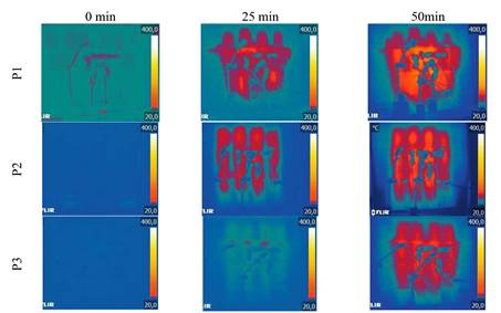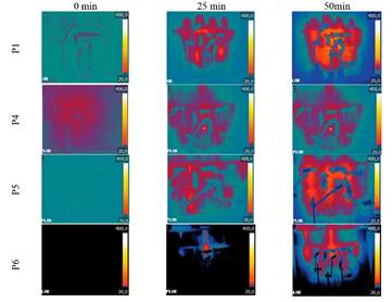 La diferencia en el color y, por lo tanto, en la temperatura que se puede ver entre las primeras imágenes (tiempo 0 min) de cada figura se refiere a las diferentes temperaturas ambientales en los días de los ensayos, que varían mucho a lo largo del año en la región donde se tomaron.