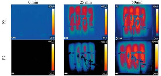 También se visualiza un patrón de calentamiento diferente para las muestras P2 y P7, hechas con bloques tipo B2, con resistencia de 10 MPa, donde la temperatura se propaga esencialmente a través de las cavidades (Figura 11). El patrón es similar al observado por Nguyen y Meftah (2012), quienes identificaron temperaturas más altas en los alvéolos de los bloques. Según los autores, en un muro los principales mecanismos de transferencia de calor son la convección y la radiación, por lo tanto, las temperaturas medidas en las cavidades de los bloques son más altas que las medidas en sus paredes transversales, donde el calor se propaga por conducción. Dicho esto, el patrón observado se debe al hecho de que las paredes de estas unidades son masivas y, por lo tanto, la propagación del calor es menor en estas regiones que en los bloques de paredes huecas.