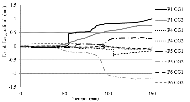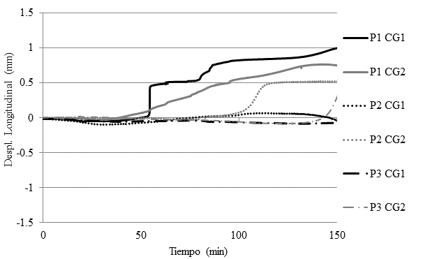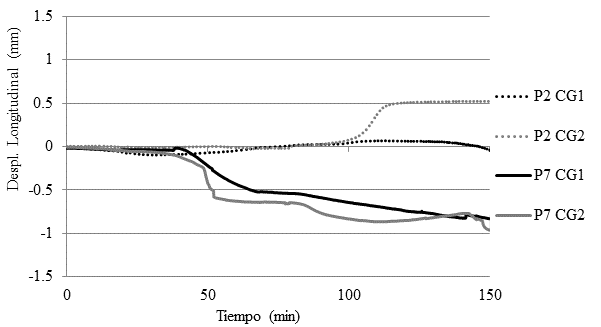 Una de las observaciones que pueden hacerse a partir de los resultados presentados es que las muestras con juntas más flexibles tienden a permitir que el bloque se dilate, formando un sistema más deformable en comparación con los demás. Este comportamiento se puede observar en la muestra P1, por ejemplo, donde los transductores fijados al bloque central - CG 1 y CG 2 - mostraron un comportamiento que indica expansión en ambas direcciones (Figura 12). El inicio de la dilatación coincide con el momento en que la temperatura de la superficie exterior comienza a elevarse.