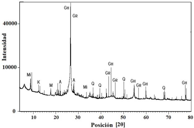 Figura 2 Difractogramas de rayos -X de GP. Mi: mica; K: caolinita; M: montmorillonita; GH: grafito(2H); GR: grafito (3R); A: anortita; Q: Cuarzo.