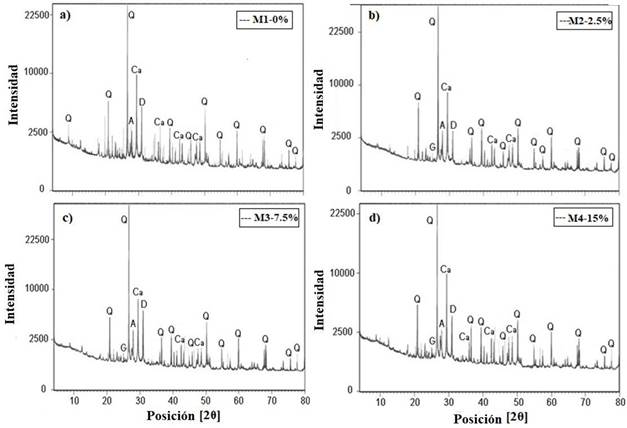 La Figura 3 corresponde a los difractogramas de la muestra control y con adición de GP, después de un periodo de curado de 28 días. El cemento hidratado de 28 días produce las siguientes fases: silicato de calcio hidratado (CSH) que es el responsable de la adherencia y resistencia con los aglutinantes, etringita (E) da mayor cohesión al cemento y la portlandita (CH) mantiene la alcalinidad, es decir, el pH de la pasta a valores altos entre 12-13 (Helena y Lucia, 2011; Giraldo y Tobón, 2006). La Figura 3a se muestran las fases cristalinas de hidratación del concreto, se observaron picos elevados de cuarzo (Q) y calcita (Ca); además de Dolomita (D) y plagioclasas o Andesina (A). Los principales elementos abundantes que aparecen en la muestra control son Q y Ca, debido a la principal presencia de calizas en el cemento.