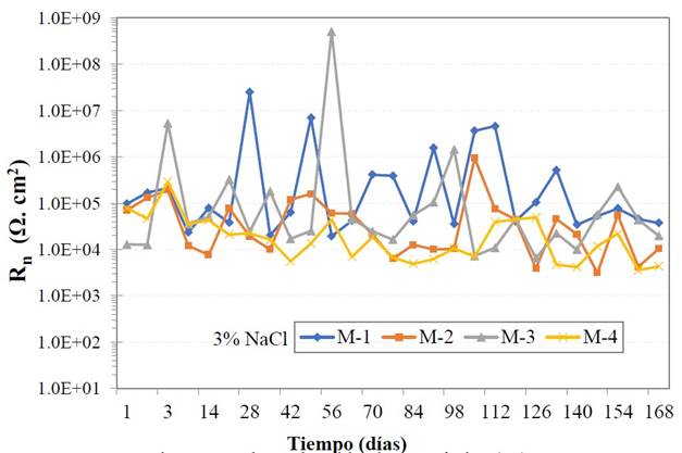 El promedio de las fluctuaciones de resistencia de ruido electroquímico se presenta en la figura 6. Al inicio de la medición todas las muestras presentan valores bajos de Rn entre 1x104 Ω.cm2 y 1x105 Ω.cm2; durante los días 28 y 70. La muestra M1 y M3 se observa fluctuaciones altos y bajos de Rn, posiblemente puede ser a la formación de películas de óxido no protector, manteniendo pasivo el metal. Al final del día 168 de exposición al medio salino, todas las muestras mantienen valores bajos de resistencia al ruido alrededor de 1x104 Ω.cm2.