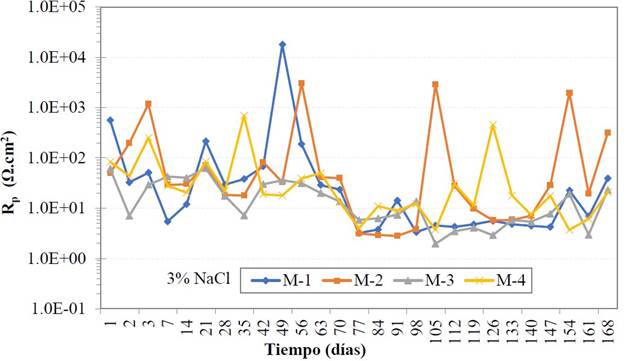 La Figura 9 muestra los valores de resistencia a la polarización en el transcurso del tiempo, se puede observar valores de Rp muy bajos, en las 24 horas de inmersión y hasta el final de la medición en el experimento de RPL. Durante los días 42 y 70 se presenta un incremento en la Rp de las muestras M1 y M2, tal vez puede indicar una disminución en la velocidad de corrosión del metal, los valores de Rp tan elevados son un indicativo de que el acero esta pasivo (Blanco et. al., 2019). Las muestras con contenido de GP, adquirieron valores contantes de entre 1x101 Ω.cm2 y 1x103 Ω.cm2; puede ocurrir una alta interacción con los iones cloruros en la interfaz del acero/concreto registrando valores muy bajos de Rp. Se muestra que los iones cloruros han despasivado el metal y el material tiene muy alta corrosión en ciertos momentos a medida que avanza el tiempo de inmersión.