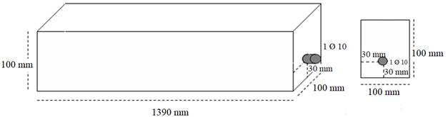 Os corpos-de-prova prismáticos foram moldados de dois em dois. Para manter o cobrimento foram colocados 3 espaçadores de 30mm ao longo da barra de aço. Na figura 2 pode-se observar as dimensões do corpo-de-prova prismático e posição da barra de aço.