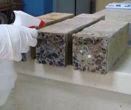 Para a análise microestrutural foram retiradas amostras dos corpos-de-prova prismáticos logo após o corte ou ruptura das mesmas e antes da realização dos ensaios de durabilidade, para que as amostras não fossem contaminadas com as soluções de nitrato de prata (Figura 6). Nesse trabalho só foram apresentados os resultados de análise microestrutural aos 6 meses e 24 meses, que foram as primeiras e últimas idades de ensaios, respetivamente.