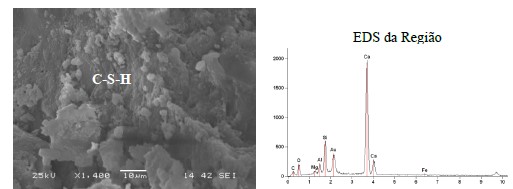 Na imagem da Figura 10 observam-se algumas agulhas, mas no EDS o elemento enxofre (S) não está presente para que se configurasse uma etringita. Nesse caso podem ser agulhas de C-S-H, com morfologia fibrosa (Tipo I) (Taylor, 1997; Ghosh, 2002). Observam-se também as fases C-S-H tipo III e tipo IV.