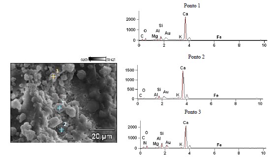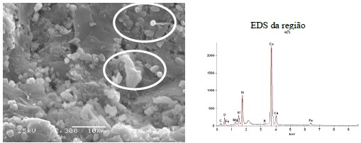 Na microanálise detectou-se a presença dos elementos Ca, K, Si, Al, Mg, O e C, que são típicos dos produtos de hidratação do cimento.