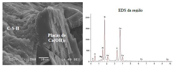 Na Figura 12 nota-se a presença de possíveis placas de Ca(OH)2 e C-S-H. Como verificado por Baroghel-Bouny (1994) Mehta e Monteiro (2008), a fase correspondente ao Ca(OH)2 mantém a alta alcalinidade do sistema, preservando a estabilidade do C-S-H e do concreto de cobrimento.