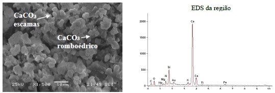 Na Figura 13 pode-se observar a formação do carbonato de cálcio na forma de cristais romboédricos e em forma de escamas, sobre um C-S-H poroso e possivelmente carbonatado. Observa-se nos compostos hidratados formados, a presença de carbonato de cálcio (CaCO3), com morfologias distintas sobre C-S-H que também já pode estar em processo de modificação pela ação do tempo, e devido a sua porosidade. A fase C-S-H porosa e a formação de CaCO3 indicada na Figura 13 foi observada também por Sakar et al (2001) em seu estudo, com o CaCO3 em forma de escamas, porém, em grande quantidade.