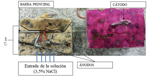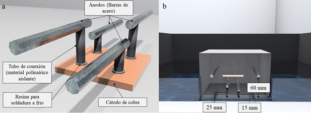 La macro-celda galvánica considerada en el estudio está formada por cobre y acero CA-50. Se utilizaron barras de acero de 60 mm de longitud y 6,3 mm (1/4") de diámetro (ánodo), instaladas a diferentes alturas sobre una placa de cobre (cátodo) de 50 por 50 mm, y 4 mm de espesor. Todos los metales fueron pulidos con cepillo de alambre de acero. A continuación, se enjuagaron con agua destilada, se sumergieron en alcohol y se secaron al aire. La placa de cobre fue configurada para que el área expuesta (Ac) fuera igual a la suma de las áreas superficiales de los ánodos (Aa) que componen la macro-celda galvánica, para una relación Ac/Aa = 0 .97. La figura 2 muestra un modelo del sensor galvánico utilizado en el estudio.