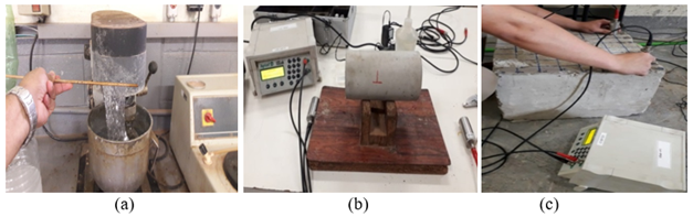Después del ensayo de asentamiento, se moldearon 12 probetas cilíndricas (100 mm de diámetro y 200 mm de longitud) y 1 probeta prismática (400 x 400 x 300 mm³) por cada traza, simulando parte de un muro pantalla después de la ejecución, totalizando 48 probetas cilíndricas. y 4 especímenes prismáticos. Las muestras cilíndricas fueron ensayadas por ultrasonido, a los 28 días, por el método directo de propagación de ondas (Figura 1b) y las muestras prismáticas por el método indirecto (Figura 1c), representando la evaluación de la inspección in loco.