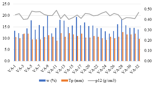 | ID | w (%) | Tp (mm) | Tp,12 (mm) | p12 (g/cm3) | VPU12 (m/s) | fk (MPa) | MED (MN/m2) | Criterio |
