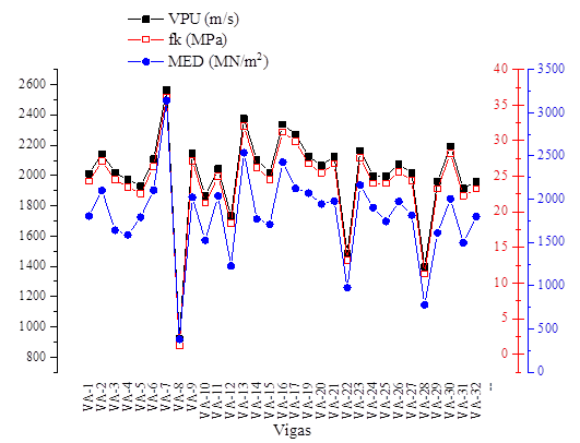 Para la realización de los ensayos de penetrómetro y VPU se prepararon dos puntos en cada viga. En cada uno se registraron 5 lecturas, para un total de 10 resultados por cada elemento. En la figura 12 se muestra un resumen de valores en algunas de las vigas ensayadas.