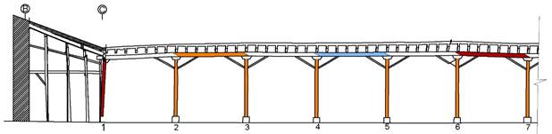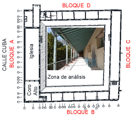 La estructura se ubica en la planta alta del primer claustro, hacia el bloque A (Figura 1). Se basa en un forjado de madera y tablazón conformado por 98 vigas de 9 cm x 13 cm (base x altura), espaciadas entre 43 cm y 45 cm con una inclinación de 17 grados desde el muro hacia los pies derechos, apoyadas por el eje 3 en el muro de tapial que conforma la iglesia, y por el eje 4 en una viga corredera que descansa sobre 13 pies derechos. La viga de corredera se compone de 12 vigas unidas mediante rayo de Júpiter, las cuales descansan sobre los pies derechos (Tabla 1). La cubierta está formada por tejas de cerámica roja.