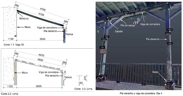La elevada precisión de los datos obtenidos por el escáner láser a partir de la unión de las nubes de punto y la obtención del modelo 3D, permite realizar las mediciones de los elementos del forjado sin necesidad de intervenir sobre ellos. Para trabajar con secciones representativas del mismo y los pies derechos, se establecieron regiones y se ajustaron las vistas para obtener imágenes medibles. En el caso del forjado de madera, se extrajo una sección entre las vigas 35 a la 49, mientras que para los elementos de soporte, se seleccionó una sección de los pies derechos 5 y 6. Los resultados se muestran en la figura 3. El resumen de las escuadrías se indica en la tabla 2.