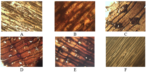 Mediante la aplicación del método de anatomía comparada a partir de los cortes histológicos realizados en dirección transversal, tangencial y radial, se obtuvo como resultado que las especies de madera que forman la estructura del forjado y el sistema de apoyo de los pies derecho son: cedro (Cedrela odorata), pino (Pinus sp.), baría (Cordia gerascantus), caguairán (Guibourtia himenifolia) y ácana (Manilkara grisebachii). En la figura 5 se muestran los cortes histológicos realizados para la identificación de las especies de madera existentes.