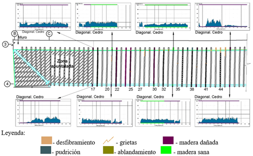 Figura 7 Resultados de ensayos de resistografía y lesiones en elementos del forjado entre las vigas 50-98