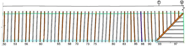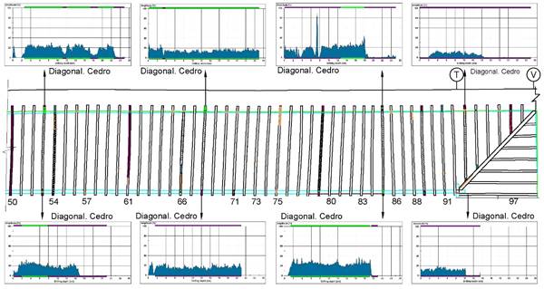 El análisis realizado con el resistógrafo permitió identificar que de las 98 vigas que conforman el forjado, 64 de ellas presentan diferentes manifestaciones patológicas asociadas a pudrición por exposición a ciclos de humectación y secado. La resistografía se inició en la zona de la fogonadura debido a que es el área más vulnerable, y en función de los daños detectados se realizaron mediciones también en el centro de la luz o próximo a los apoyos (Figuras 6 y 7).