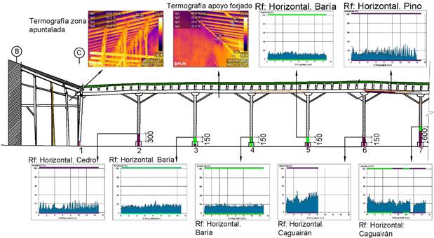 Figura 8 Resultados de ensayos en elementos del forjado entre pies derechos 1-7, donde la termografía refleja la humedad presente en el muro del eje 3 en la zona de apoyo de las vigas, y la resistografía en pies derechos y viga de corredera del eje 4.