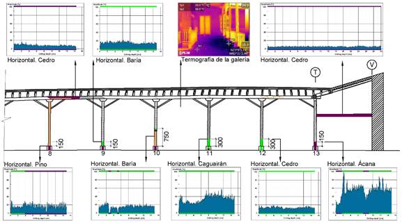 Los contenidos de humedad medidos en las vigas del forjado se encuentran entre 9%-19%, en los pies derechos entre 11%-17% y la viga de corredera entre 11%-12%. Las imágenes termográficas obtenidas reflejaron como el muro de apoyo presenta zonas de elevada humedad, lo cual favorece la absorción de agua en la madera por ser un material higroscópico.