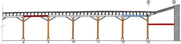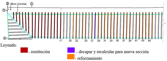 En las vigas del forjado se determinó que 17 de ellas requieren ser sustituidas por su avanzado deterioro. Adicionalmente otras 45 vigas deberán ser reforzadas estructuralmente en diferentes zonas, en función de las patologías desarrolladas en cada una. De las 34 vigas restantes a las que no se le identificaron lesiones significativas, será necesario desmontar y decapar 2 de ellas debido a deterioros superficiales, para posteriormente recalcular la carga para la nueva sección de viga (Figuras 10 y 11). Todos los pies derechos mostraron deterioros que requieren acciones de reforzamiento estructural, así como en las vigas de corredera, donde será necesario la sustitución de dos tramos, y el reforzamiento de otros 3 tramos (Figuras 12 y 13). La disminución significativa de la densidad de las maderas del forjado es el resultado de la exposición a ciclos de humectación y secado, fundamentalmente en los meses de lluvia, con la consecuente proliferación de hongos e infestación de termitas. Las deformaciones presentes en las vigas no solo son el resultado del incremento del peso por exceso de agua y el crecimiento de plantas superiores, sino también debido a la perdida de sus propiedades maderables, lo cual incrementa el riesgo de fallo estructural.