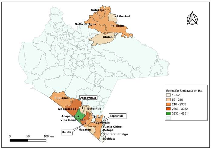 Mapa 2 Municipios productores de palma de aceite en Chiapas en el año 2018
