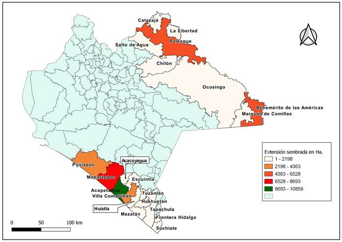 | Municipio | Total (Ha) | Café | Mango | Maíz | Pal/aceite | Plátano | C/azúcar | Cacao | Frijol |