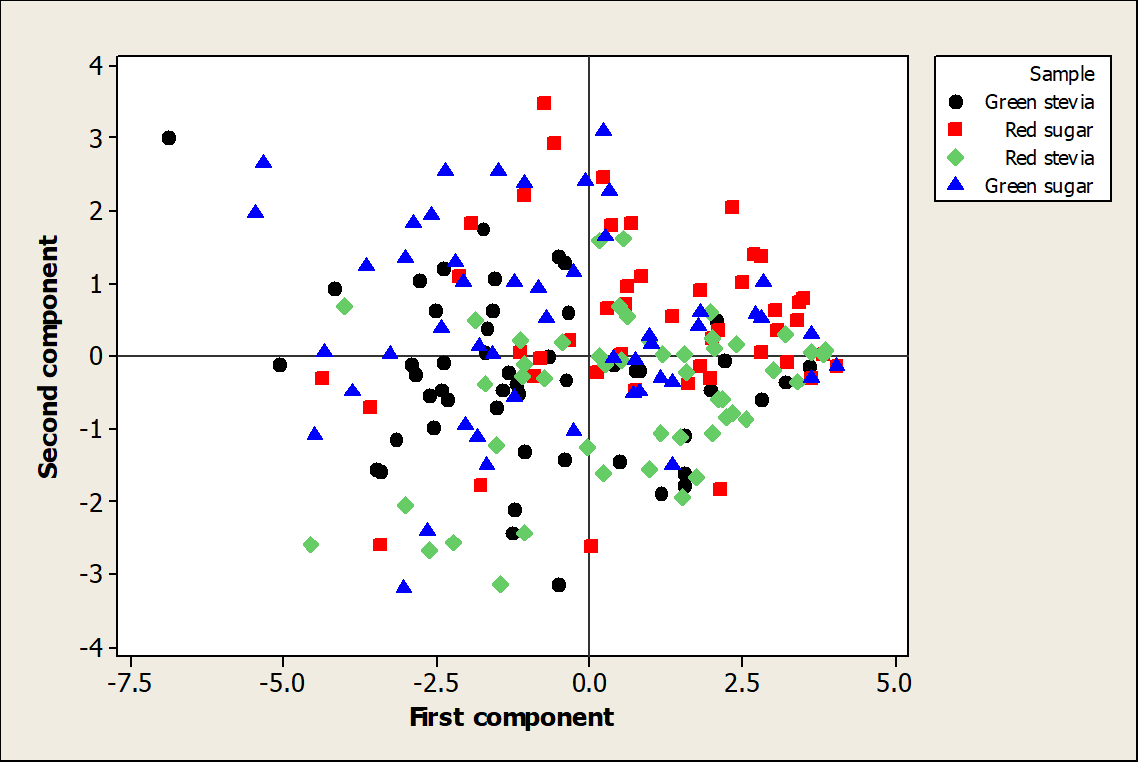 Principal component analysis (PCA) is the most widely used multivariate statistical tool in sensory analysis. The first principal component corresponds to the first eigenvalue and thus explains the largest percent of the total variability in the data, the second PC follows in the percent of the variance explained and it is not correlated with the first principal component and so on [43].