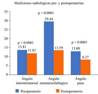 En cuanto a las mediciones radiográficas, estas se toman siempre en proyecciones dorsoplantar y lateral que se toman con los pacientes de pie y con apoyo (Figura 3). Los valores de las mediciones tanto prequirúrgicas como postquirúrgicas se pueden ver en la Figura 4. Nuestros resultados reflejan una disminución en promedio de 2o del ángulo intermetatarsal. Estos valores reflejan una variación de los ángulos consistente con las correcciones logradas en otros estudios mediante el uso de osteotomías distales.8,9