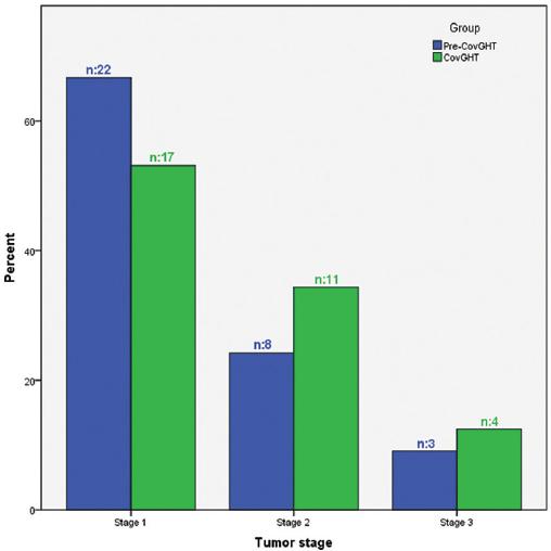 Figure 2 In terms of tumor stage, 22 (66.7%) of 33 patients in the Pre-CovGCT group were stage 1, 8 (24.2%) were stage 2 and 3 (9.1%) were stage 3; in the CovGCT group, 17 (53.1%) of 32 patients were identified as stage 1, 11 (34.4%) as stage 2, and 4 (12.5%) as stage 3 (p = 0.6).