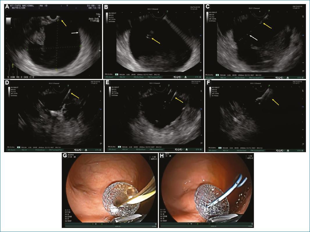 Figura 1 Drenaje de PQP por USE. (A) Delimitación de las paredes (flecha blanca), diámetro (líneas punteadas) y el sitio de punción (flecha amarilla); (B) Introducción de aguja 19 gauges (flecha amarilla); (C) Introducción de guía 0.035 (flecha blanca) a través de la aguja (flecha amarilla); (D) Introducción de cistostomo 6 french (flecha amarilla); (E) Dilatación de fístula con balón CRE (flecha amarilla) hasta 4 mm; (F) Liberación de prótesis metálica (flecha amarilla); (G) Visión endoscópica de copa interna de prótesis metálica; (H) Prótesis plástica liberada, visión endoscópica.