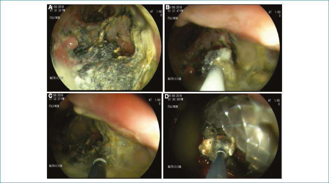 Figura 3 Necrosectomía endoscópica. (A) Se observa abundante material necrótico dentro de colección; (B) Se utiliza asa con red para retiro de material necrótico; (C) Se utiliza trípode para retiro de material necrótico; (D) Se retiran restos necróticos a la luz del tubo digestivo.