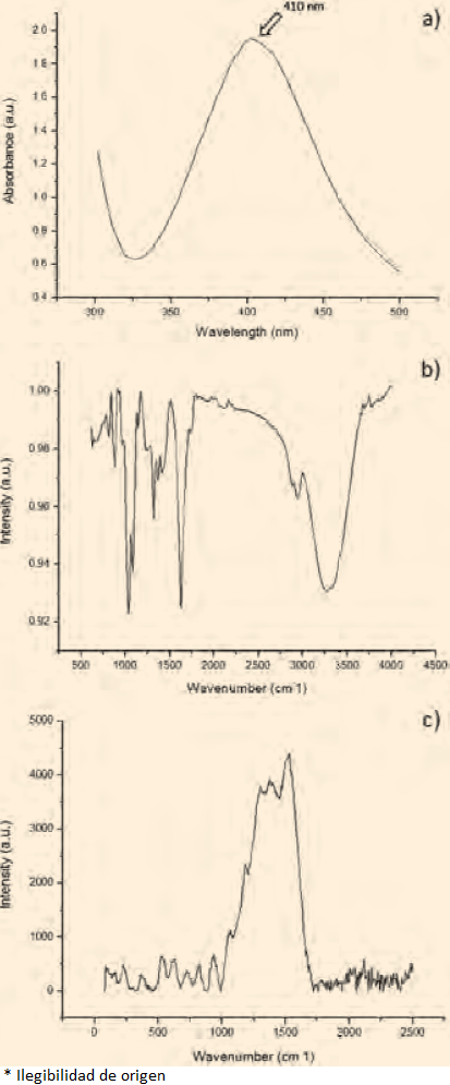 La caracterización espectroscópica de UV-Vis presenta el plasmón de superficie característico de las nanoesferas de plata con resonancia en la región de 410 nm como se muestra en la Figura 2a. Los espectros de FT-IR y Raman-Dispersivo muestran picos característicos de las nanoestructuras de plata (Figuras 2b y 2c).