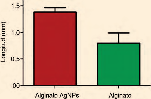 Figura 5 Valores promedio y desviación estándar del tamaño de las zonas de inhibición creadas por los grupos de alginato con nanopartículas de plata y alginato sin modificar.