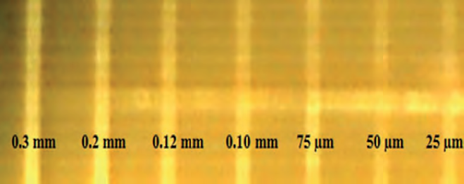 La Figura 6 muestra la micrografía del modelo de yeso con la reproducción de la impresión tomada con alginato con AgNPs, la cual resultó idéntica a la impresión tomada con alginato sin modificar; mostrando que se han reproducido exactamente todos los carriles marcados desde el que mide 0.3 mm hasta el de 25 µm, coincidiendo con los carriles originales de la placa metálica impresionada.
