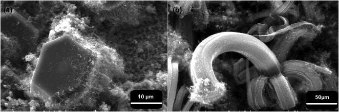 Figura 14 Imágenes obtenidas por microscopías de barrido mostrando los microcristales. (a) Sin crecimiento de nanotubos de carbono. (b) Con crecimiento de nanotubos de carbono.