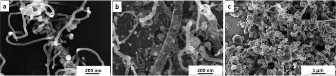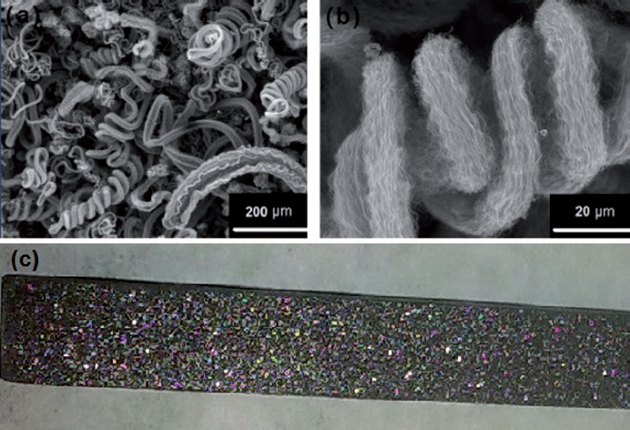 Para la síntesis de nanotubos de carbono ensamblados en doble espiral es necesario preparar el sustrato metálico, que consiste en un acero al carbono. El sustrato es introducido en un reactor de acero tubular y gas inerte en su interior, a una temperatura de 900 °C, con una mezcla de 8g de alúmina (Al2O3) y 1g de fluoruro de amonio (NH4F) mezclado con 1g de nanopartículas de dióxido de silicio (SiO2). En la Figura 9c se muestra el sustrato metálico con el tratamiento termoquímico; los sustratos metálicos son sometidos al crecimiento de MWNT’s por el método de depósito de vapores químicos. Sus aplicaciones están actualmente en investigación, aunque ya existen reportes de su uso como biosensores, biocatalizadores, dispositivos mecánicos, dispositivos de almacenamiento de energía electroquímica y fotodetectores[10-12].