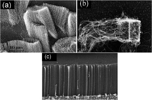 Figura 17 Nanotubos de carbono alineados crecidos en diferentes sustratos metálicos: (a) aluminio y silicio[15], (b) óxido de magnesio[16] y, (c) níquel y cobre[17].