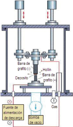 Descarga por arco eléctrico: consiste en generar una descarga eléctrica continúa entre dos electrodos, produciendo luz y calor intensos, dentro de una atmósfera de gas inerte. Sujetas a una diferencia de potencial y presión aproximados de 50 V y 400 Torr, respectivamente. Bajo estas condiciones, a través del electrodo de grafito se hace pasar una corriente intensa, lo cual evapora los átomos de carbono, generando un plasma alrededor de los electrodos; el electrodo positivo alcanza altas temperaturas, formando nanotubos de carbono, cuya longitud suele ser corta. En la Figura 2 se muestra un ejemplo del dispositivo que suele utilizarse para la obtención de CNT’s mediante el método de descarga por arco eléctrico.