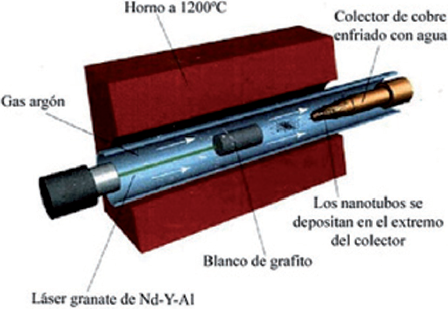 Ablación láser: se basa en iluminar barras de grafito con pulsos intensos de luz láser, utilizando distintos tipos de catalizadores (Ni, Co, Fe) que permiten obtener nanotubos monocapa. En la Figura 3 tenemos un dispositivo típico para la obtención de los nanotubos de carbono mediante ablación láser, también las barras de grafito por luz proveniente de un láser ND:YAG mientras se encuentran en una atmosfera de argón a una presión de 500 Torr a 1200 °C; los CNT’s son recolectados en la superficie de una lámina de cobre.