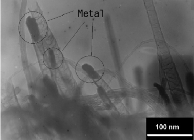 En el Laboratorio de Nanociencia y Nanotecnología de Grupo Jumex se diseñan, procesan y analizan una gran variedad de MWNT’s mediante el proceso de CVD. Hoy en día este proceso de síntesis es muy popular para la obtención de nanotubos de carbono pues permite obtener nanotubos de alta pureza y en gran cantidad. Básicamente, se induce la descomposición térmica de un vapor de hidrocarburos (por ejemplo, tolueno, benceno o acetileno), en presencia de un catalizador metálico, que se deposita en sustratos de silicio, grafito o sílice. La obtención de nanotubos de carbono mediante este proceso demora típicamente entre 10 y 60 minutos, a temperaturas que se encuentran entre los 600 y los 900 °C, bajo una atmósfera de gas inerte, que usualmente es de argón o nitrógeno. En la Figura 6 mostramos el mecanismo del crecimiento de los MWNT’s, éste se puede describir de la siguiente forma: el vapor de hidrocarburos entra en contacto con la partícula metálica caliente, primero se descompone en hidrógeno y carbono, el hidrógeno se evapora y el carbono se impregna al metal formando cilindros de carbono[6]. Este modelo de crecimiento es evidente en las imágenes de los MWNT’s que se obtienen mediante microscopía electrónica de transmisión (TEM). En dichas imágenes se observa la partícula metálica al inicio de un nanotubo de carbono, como se indica en la Figura 7.