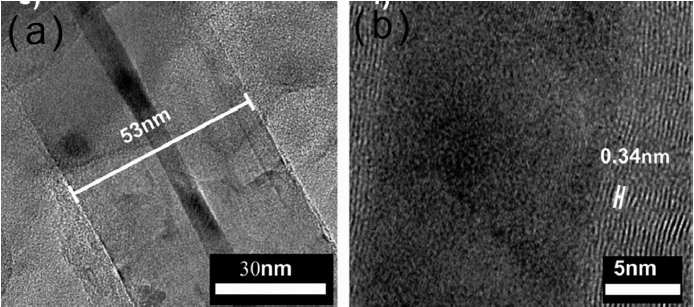 Figura 8 Imágenes TEM típicas de los MWNT’s. (a) Nanotubo de carbono con 53 nanómetros de diámetro. (b) Múltiples capas de carbono separadas por una distancia de 0.34 nanómetros, formando las capas de un nanotubo de carbono[8].