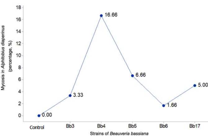 The Bb5 strain recorded (1.00±1.15 A. diaperinus beetles with mycosis) equivalent to 6.66% (figure 1). With the lowest value in strains Bb3 and Bb6 (3.33 and 1.66% of mycosis) respectively.