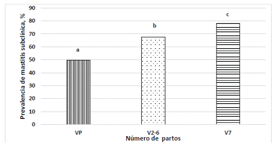 Cuando se evaluó el efecto del número de parto, las vacas de 7 partos y más mostraron los valores más altos (P≤0.05) de prevalencia de mastitis subclínica (78.2%) comparados con 67.5 y 50.0% de los animales V2-7 y VP respectivamente (Figura 1). Se observó un incremento en la prevalencia de mastitis subclínica conforme avanza el número de parto.