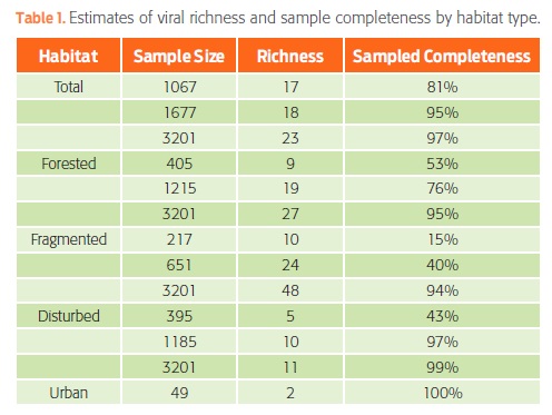 Based on the 17 virus genotypes discovered, we estimated a maximum richness of 23 genotypes using a Chao2 statistic model (Chao and Jost, 2012). The sampling effort of 1,067 samples represents a completeness of 81% in relation to the estimated viral richness. The rarefaction sample coverage function estimates 97% completeness with a sample size of 3,201 (three-fold sample size) (Fig. 2). The comparison between habitats showed the highest value of completeness (53%) in forested habitat, followed by disturbed (43%) and fragmented (15%) habitats. The estimates of viral richness with a three-fold original sample effort by habitat were 24 from fragmented habitats, 19 from forested habitats and 10 from disturbed habitats (Table 1).