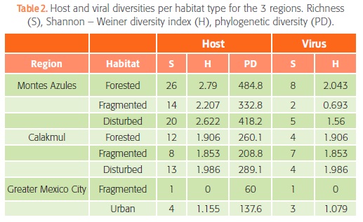 In this study, we examined the relationship between host diversity and the diversity of four viral taxa in bats from human-dominated landscapes in Mexico. Two hypotheses were tested related to the effect of host species and host phylogenetic diversities on viral diversity and the influence of habitat type on the composition of host and viral communities. First, we hypothesized that (1) host communities with high species and phylogenetic diversities will support high values of viral diversity; (2) changes in host and viral community composition across a habitat type will be reflected in high values of beta diversity and phylogenetic-beta diversity.