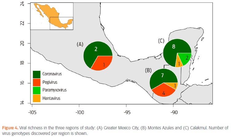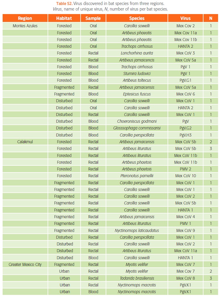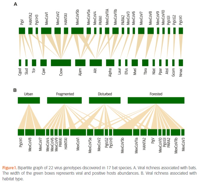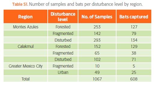 We acknowledge the Consejo Nacional de Ciencia y Tecnología (CONACyT) and the Posgrado en Ciencias de la Producción y Salud Animal of Universidad Nacional Autonóma de México. We are grateful to the Comisión Nacional de Áreas Protegidas (CONANP), Rafael Lombera, who supported fieldwork in the Reserva de la Biósfera Montes Azules, and Rafael Ávila, who helped with bat sampling in Mexico City. We would also like to thank the Disease Ecology Group of Departamento de Etología, Fauna Silvestre y Animales de Laboratorio from Facultad de Medicina Veterinaria y Zootecnia, Universidad Nacional Autónoma de México.