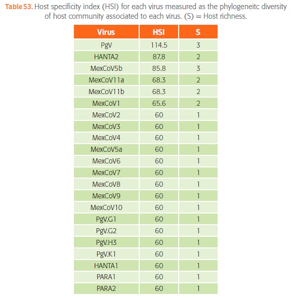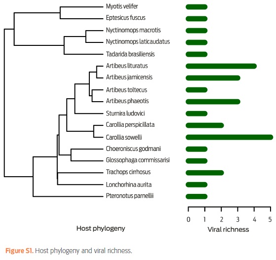 The phylogenetic host specificity calculated in this study not only reflects the number of bat species infected by a single virus but also helps to explore the phylogenetic relationships among these species. Our findings show that few viral species possess high host plasticity, such as PgV and HTV 2, while most viruses detected showed high phylogenetic specificity. Due to the quality of our data, we cannot conclude that viruses found in only one bat species are strictly exclusive to them, and further studies are needed. However, the coronavirus family showed high host phylogenetic specificity at the genus level, as shown in Anthony et al., 2013b).